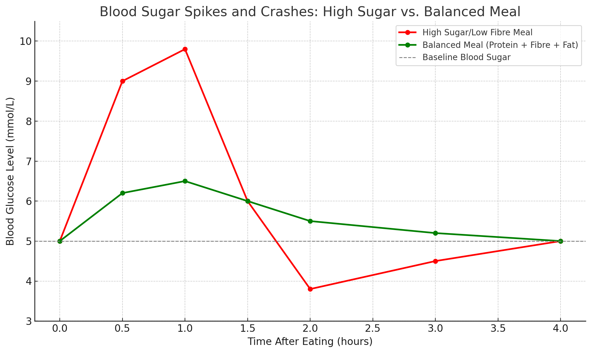 This is why balanced meals (with protein, fibre, fat, and starchy carbs) matter, they help keep your blood sugar steady, so you’re not constantly spiking and crashing throughout the day.